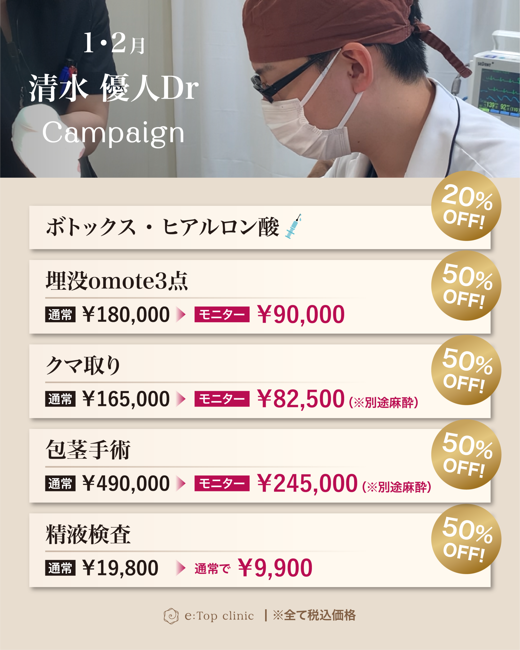 埋没omote3点 50%OFF!90,000円 クマ取り50%OFF!82,500円 包茎手術 50%OFF!245,000円 精液検査 50%OFF! 9,900円