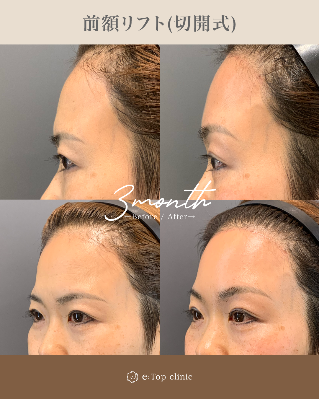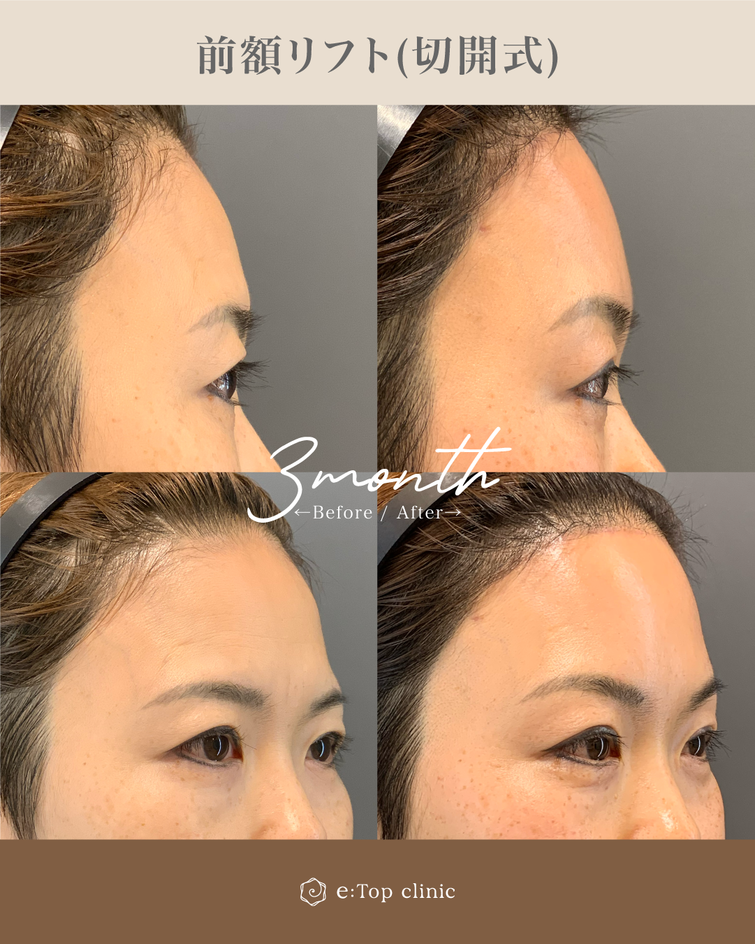 刻まれてしまっている額の横ジワがお悩みだったお客様。 切開式前額リフトにより、額にハリが出てお悩みだった額の横ジワが改善しました。 額やまぶたの重さが軽くなったことで、頭痛や肩こりも軽減し、目元もすっきりとした印象になりました。 二重幅も広がり、大変ご満足いただきました。 術後まだ3カ月の為、傷跡の赤みや凹凸は今後さらに落ち着き、より綺麗に整っていきます。