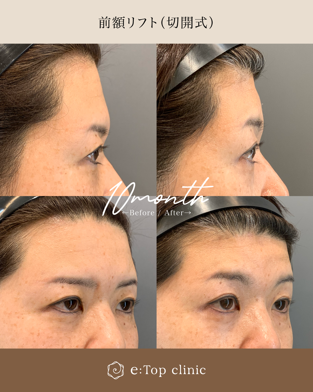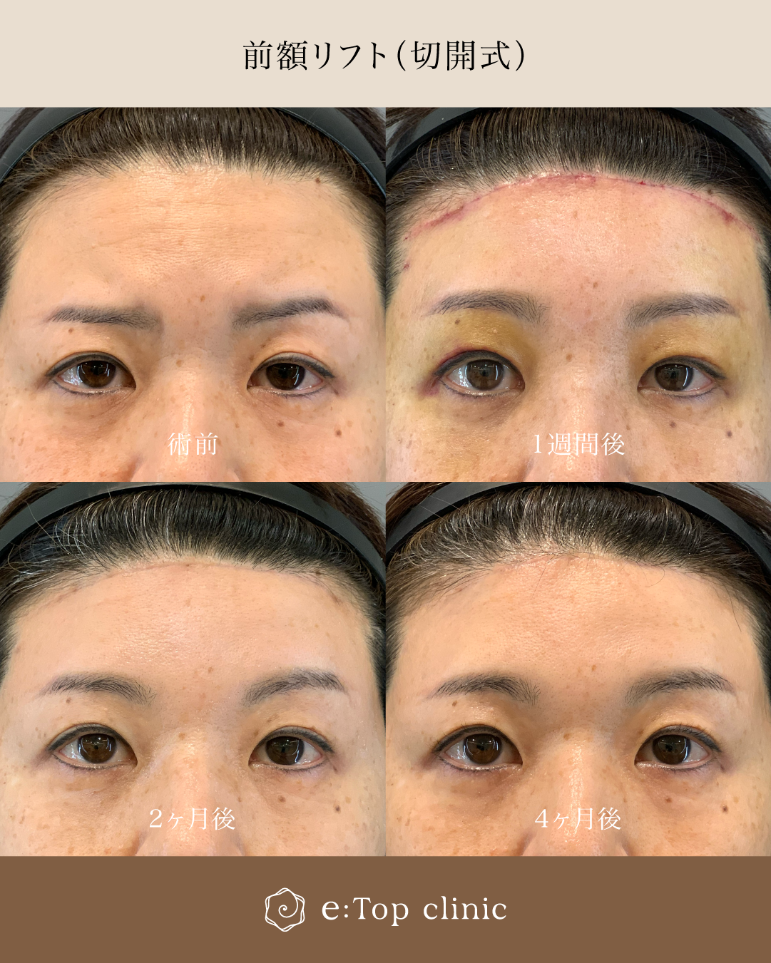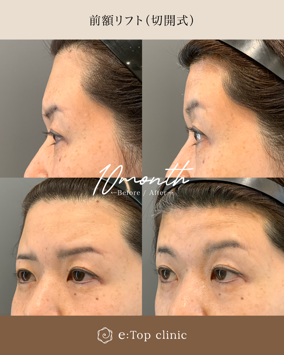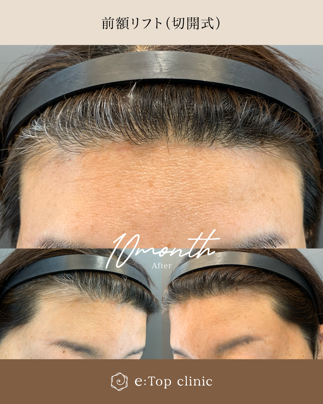 眉の位置、あげ方に左右差があり、額のシワも気になっているお客様。 眉の位置を上げるためにも、前額リフト(切開式)が適応でした。 額のたるんだ皮膚を引き上げて、眉の位置を調整し、額が上がったことで、目も開きやすくなりました。 たるみをリフトアップすることで肌にハリが生まれるため、額のシワや眉間のシワの改善にも効果的です。