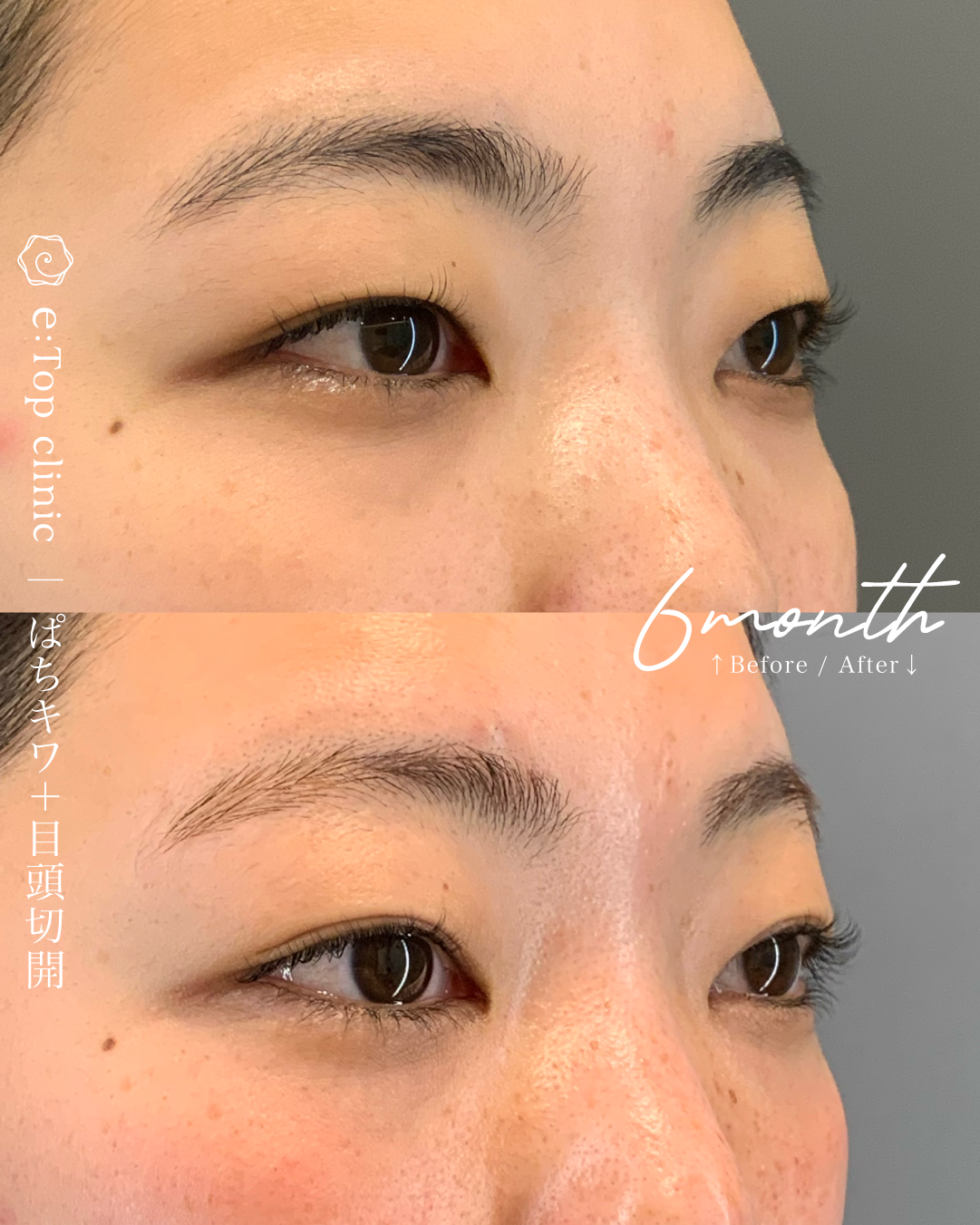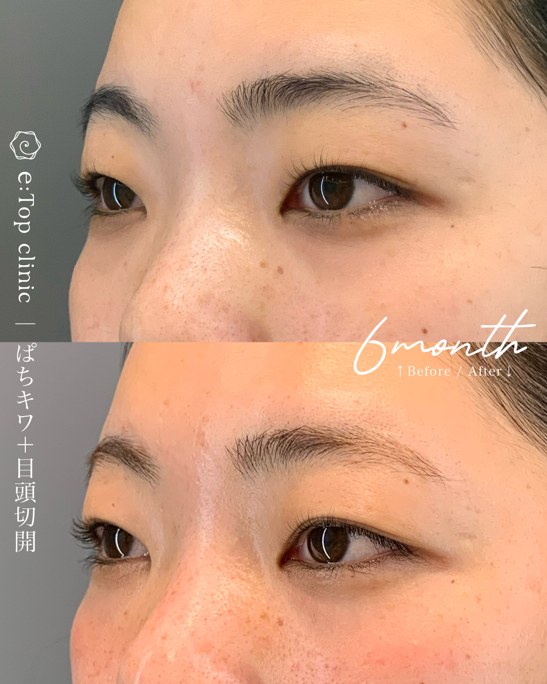 目頭側のまぶたのたるみで目の開きが悪く、印象も悪く見えてしまう事がお悩みでした。 ぱちキワで目頭側の皮膚を切除し、同時に目頭切開で蒙古ヒダを切除し、目を開けやすくしました。 術後は、「目が離れていることがコンプレックスでしたが、自然な感じに変われてやって良かった! 目が 開きやすくなり、また二重ラインも見えるようしなったので、メイクの幅も広がって嬉しい!」とご満足いただきました。
