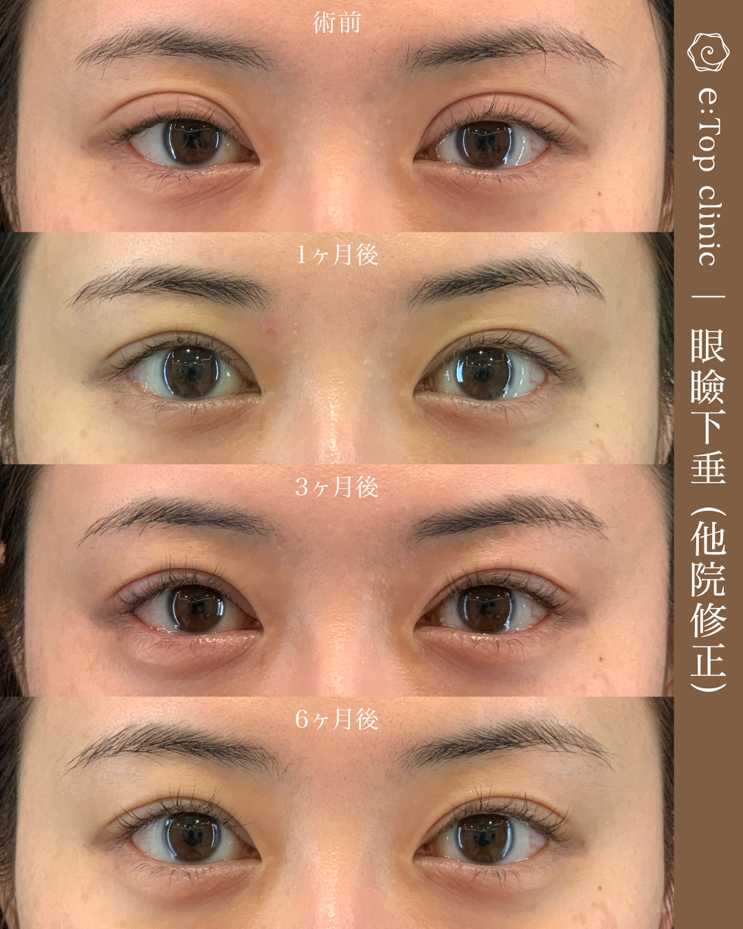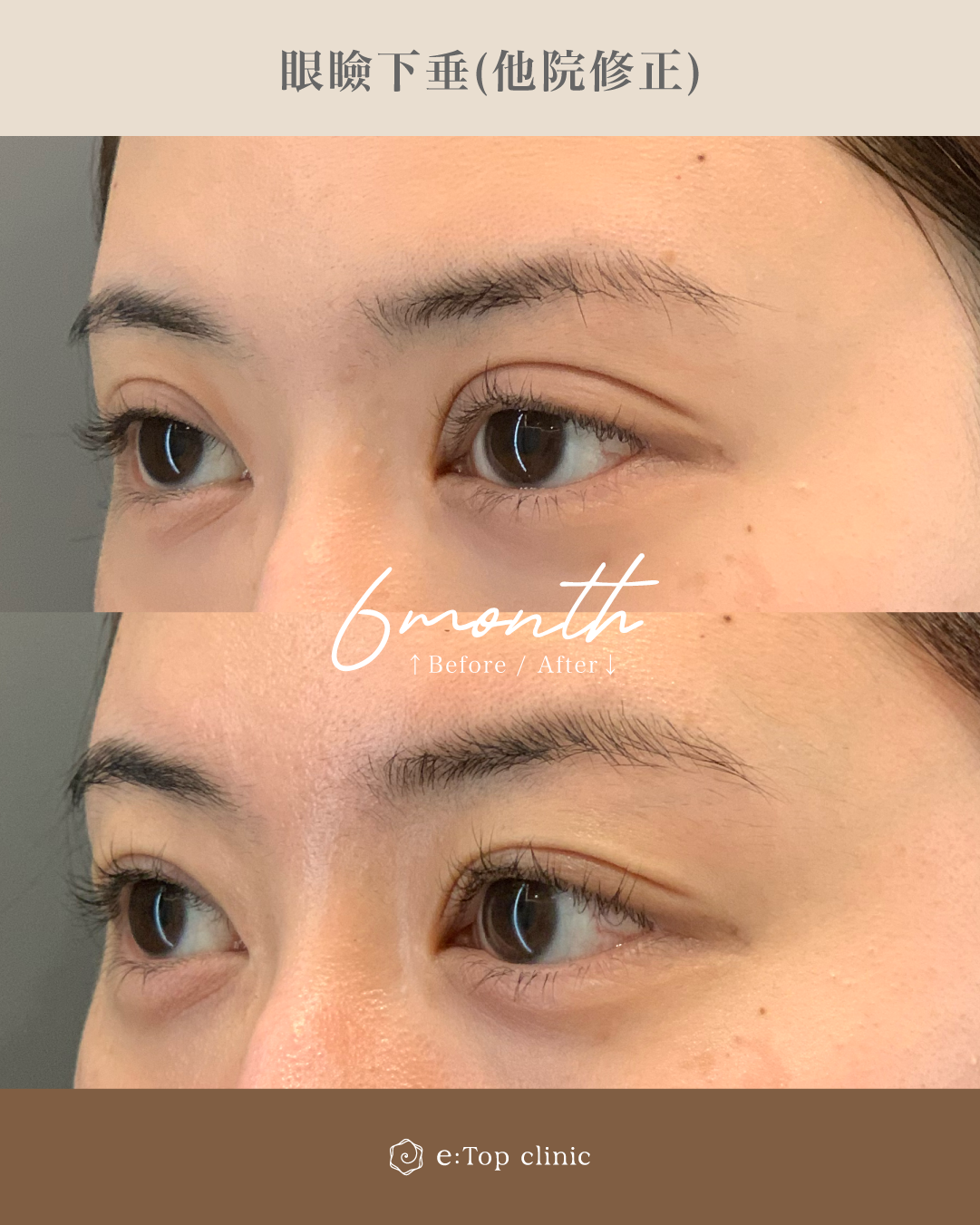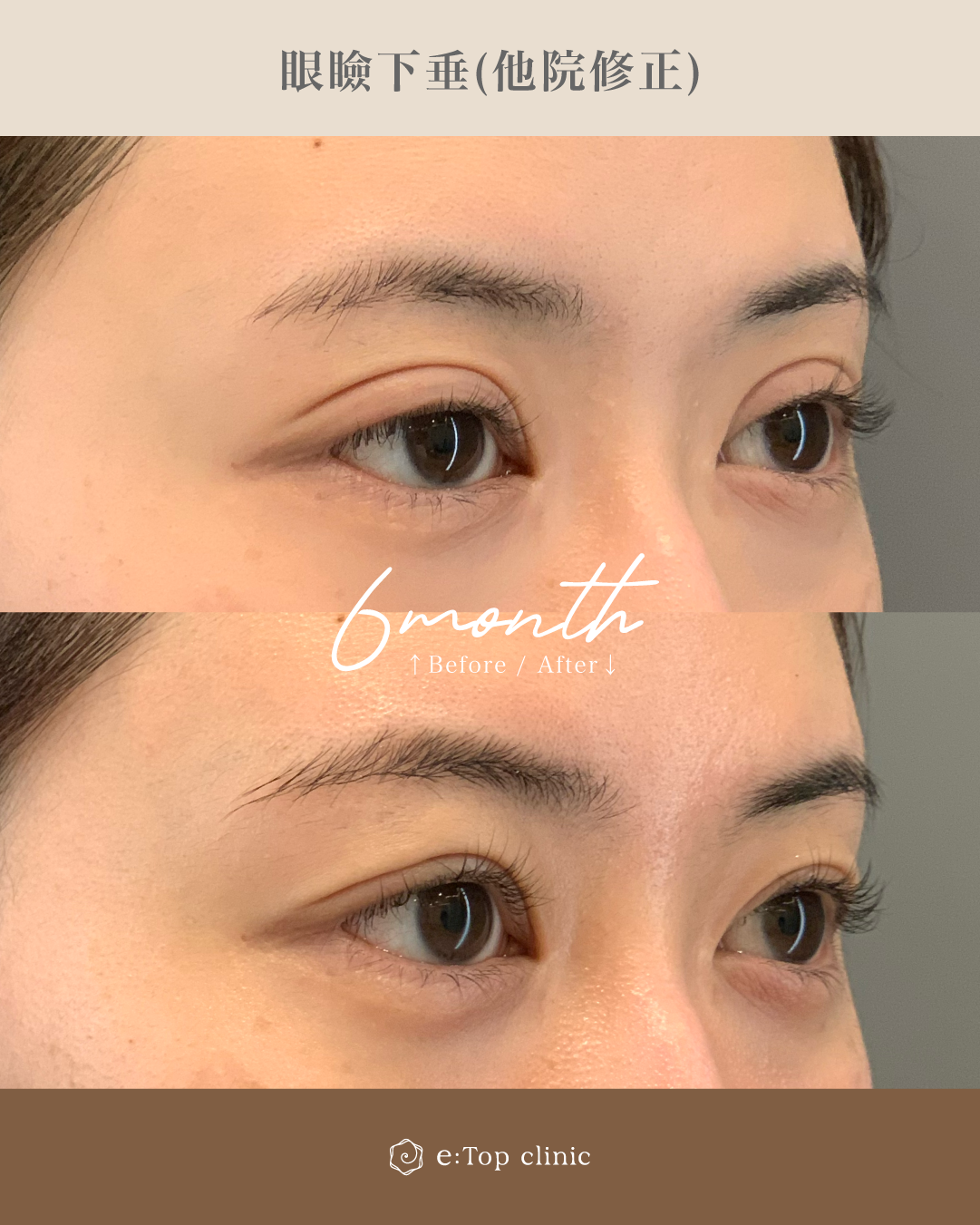 他院にて眼瞼下垂の手術を受けられましたが、左右差があることに加え、二重幅が広すぎることで、いわゆるハム目のような印象になってしまったことを気にされ、ご相談にいらっしゃいました。 診察の結果、開きの左右差も認められましたが、それ以上に二重幅の広さが影響していると判断し、二重幅を約4mm狭くする修正手術を行いました。 その結果、二重幅が広いために眠たそうに見えていた目元が、ぱっちりとした印象に改善され、自然でバランスの取れた美しい目元となりました。 ご本人様にも「イートップクリニックで手術を受けて本当に良かった」と大変ご満足いただきました。