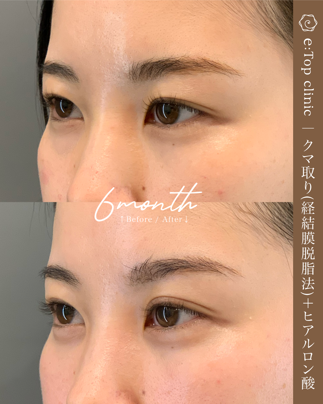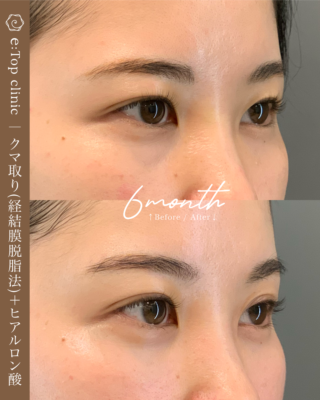 目の下のクマが気になるというお悩みでした。 クマがあると、老けた印象や疲れた印象にえてしまうことが多いです。 下まぶたの裏の赤い粘膜部分から数ミリわずかにメスを入れて眼窩脂肪を取り出す経結膜脱脂法とヒアルロン酸でご提案。 気になっていたクマが改善され、ダウンタイムもほとんど無く、ご本人様からやって良かったと仰っていただきました。