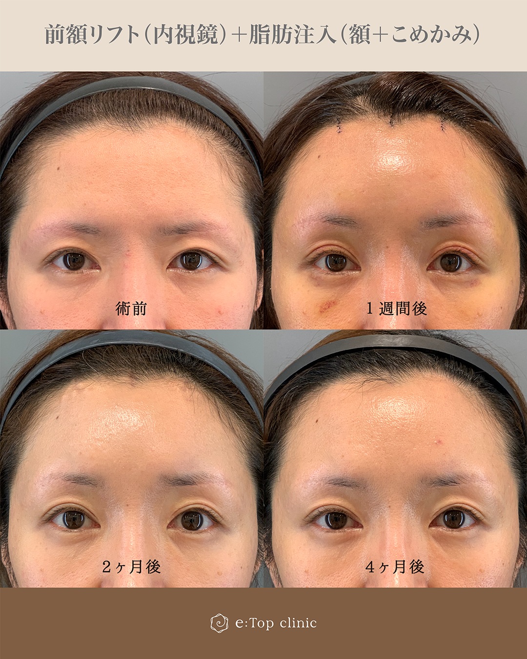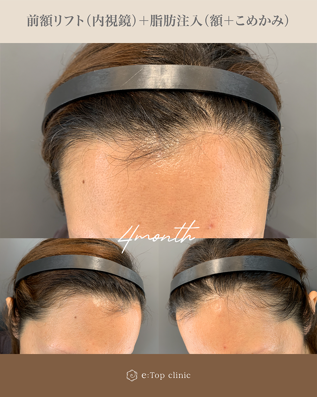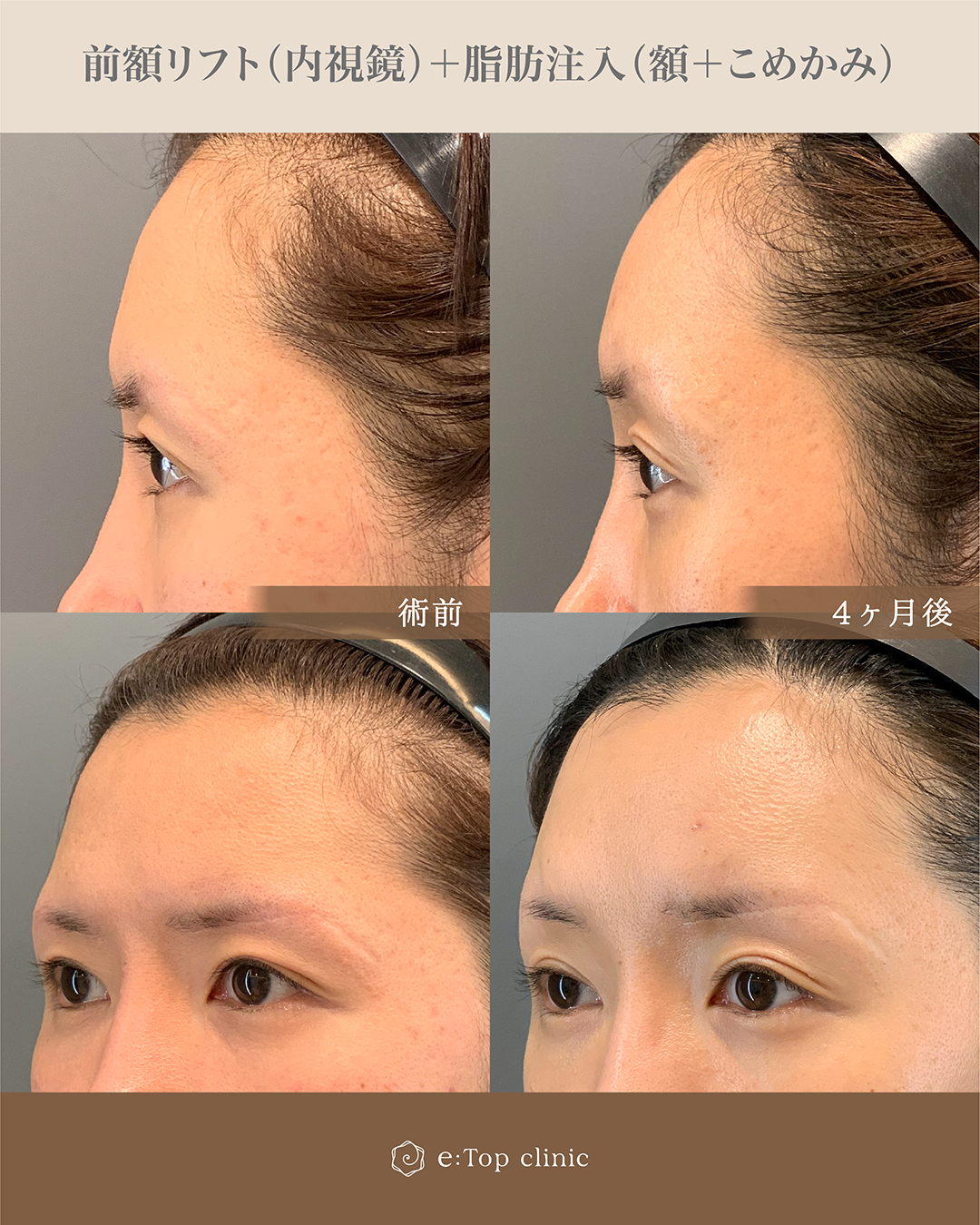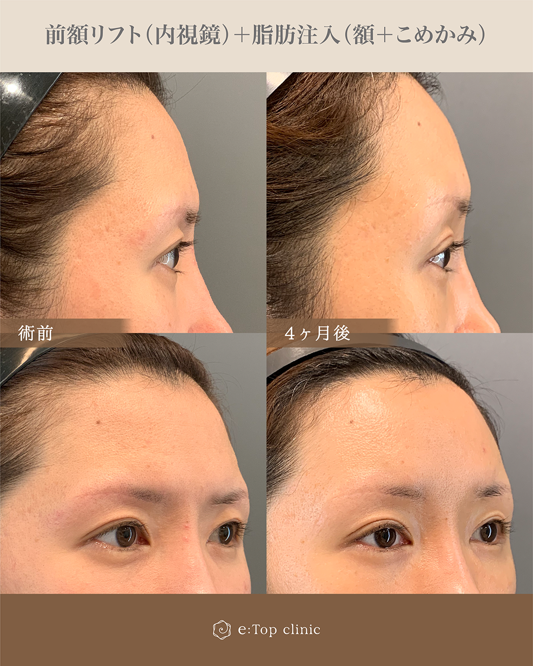目と眉が近かった為、内視鏡前額リフトでご案内し、同時に額とこめかみに脂肪注入もし、きれいに整えました。