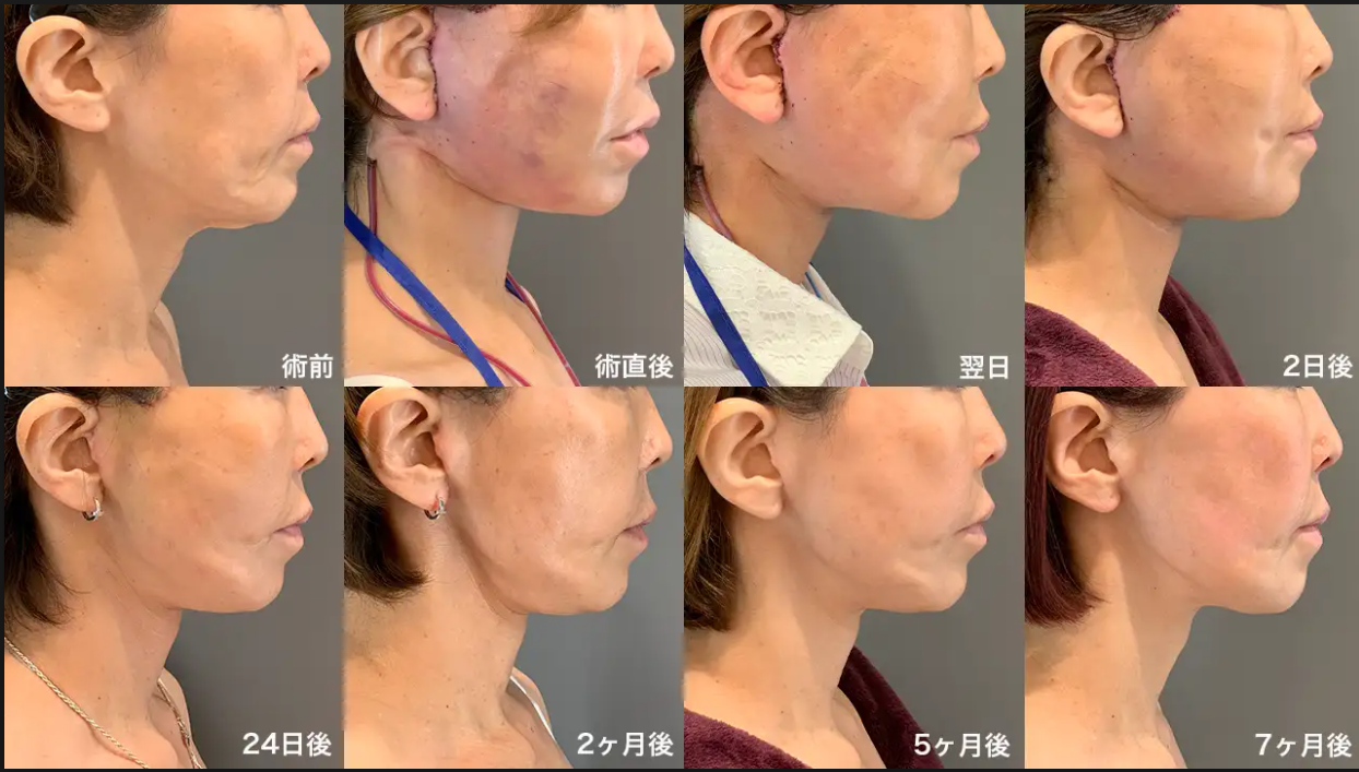 術後は、約3〜4日間、顔全体をフェイスバンドで圧迫固定する必要があり、1週間前後を目安に抜糸を行います。抜糸後は、通常のお仕事やメイクが可能となりますが、腫れや内出血が落ち着くまでには約2〜3週間程度を要します。腫れは時間とともに徐々に軽減していき、完全にむくみが落ち着くまでには2か月以上かかることがあります。また、傷跡は半年ほどかけて徐々に自然に馴染んでいきます。