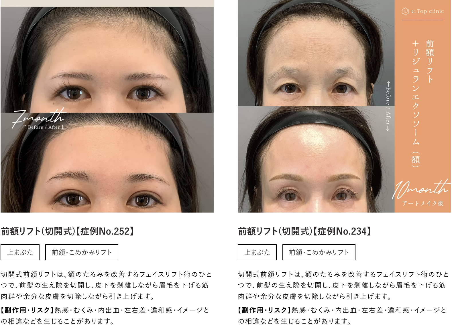 前額リフト(額リフト)やこめかみリフトの実際の経過をイメージしやすいよう、e:Top clinic(イートップクリニック)の症例ページをご案内します。