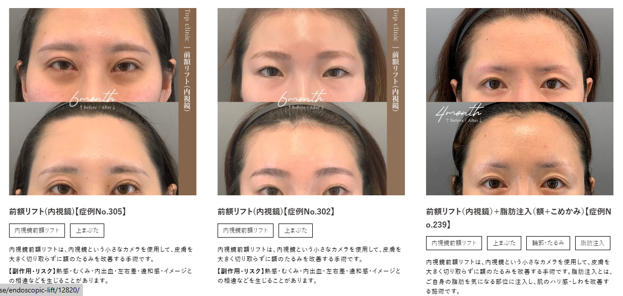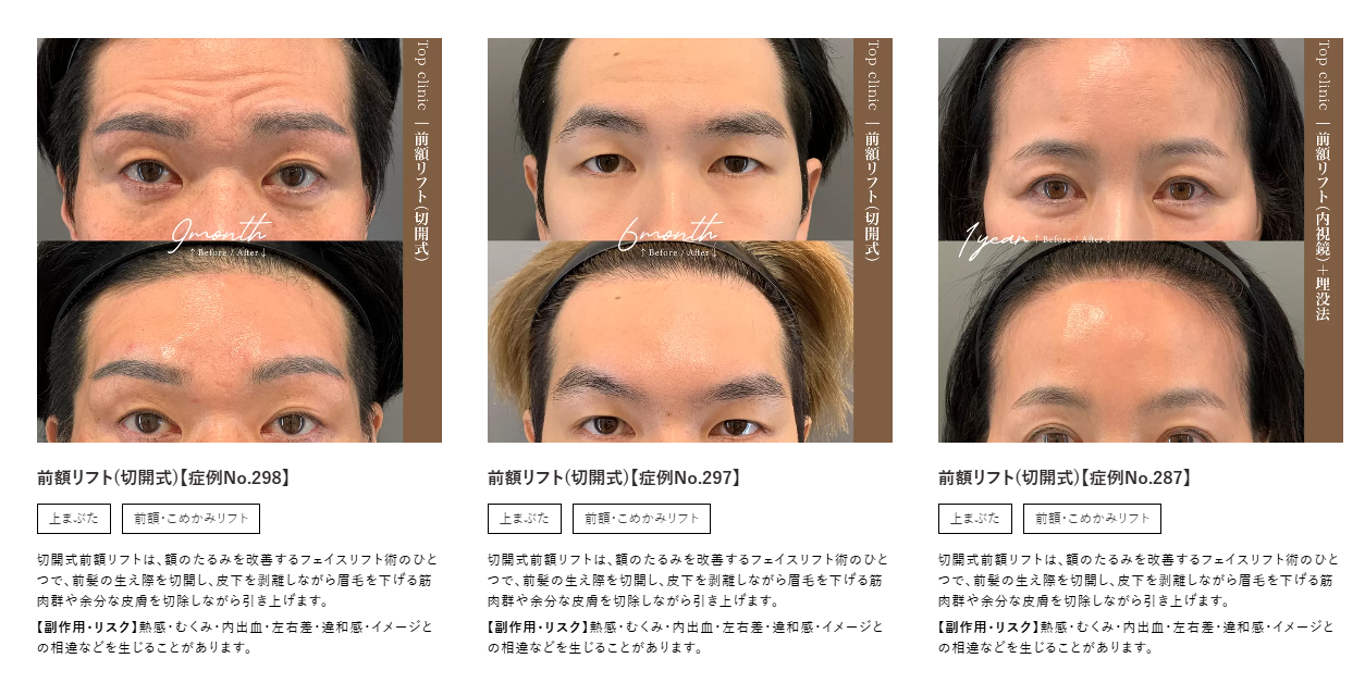 このように、切開式は額や眉間のシワが深く刻まれている方に適している傾向があり、内視鏡は額のシワが少ない方に適応となる傾向があります。いずれの術式が適しているかは、ご自身のお悩みや状態を踏まえ、医師が正しく診断することが重要です。