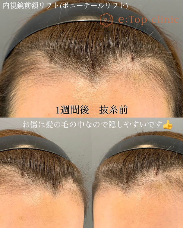 手術翌日以降から腫れが出現しますが、目立つ腫れは抜糸までの約1週間前後で徐々に落ち着いていくケースが一般的です。切開範囲が小さく、傷跡は前髪を下ろすことで日常生活では目立ちにくいため、周囲の方に気付かれにくい手術といえます。
